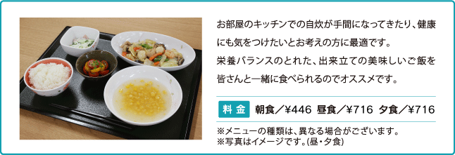 | 食費 | 朝食(446円)、昼食(716円)、夕食(716円)を30日間召し上がると1ヶ月で56,340円です。食事のキャンセルに関しましては、前もってお申し付けいただければ可能です。(朝食・前日16:00迄、昼食・当日9:00迄、夕食・当日13:00迄) |